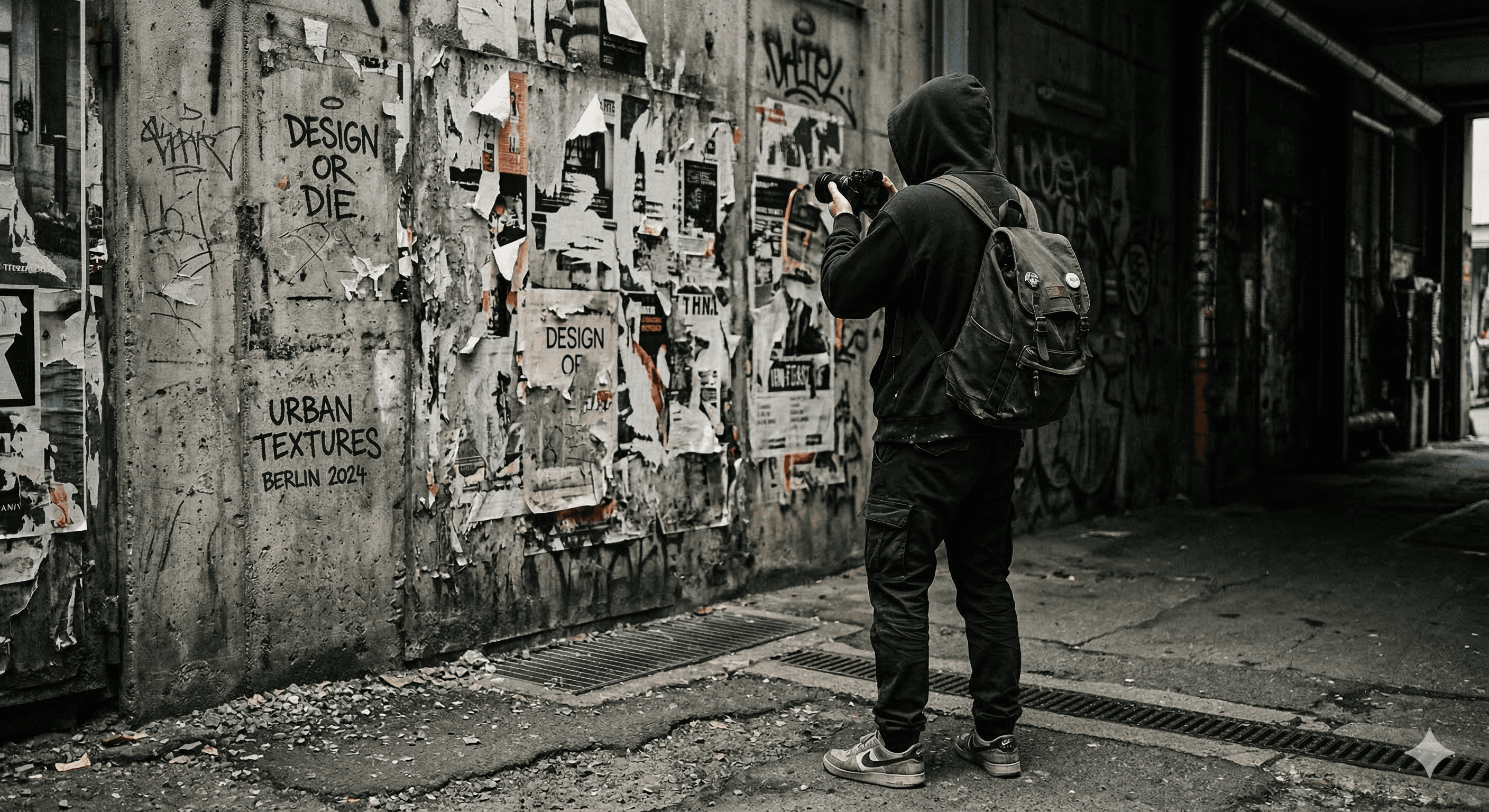 Most assets start with real surfaces, signage, materials, and visual fragments captured in the real world and refined into usable design tools.